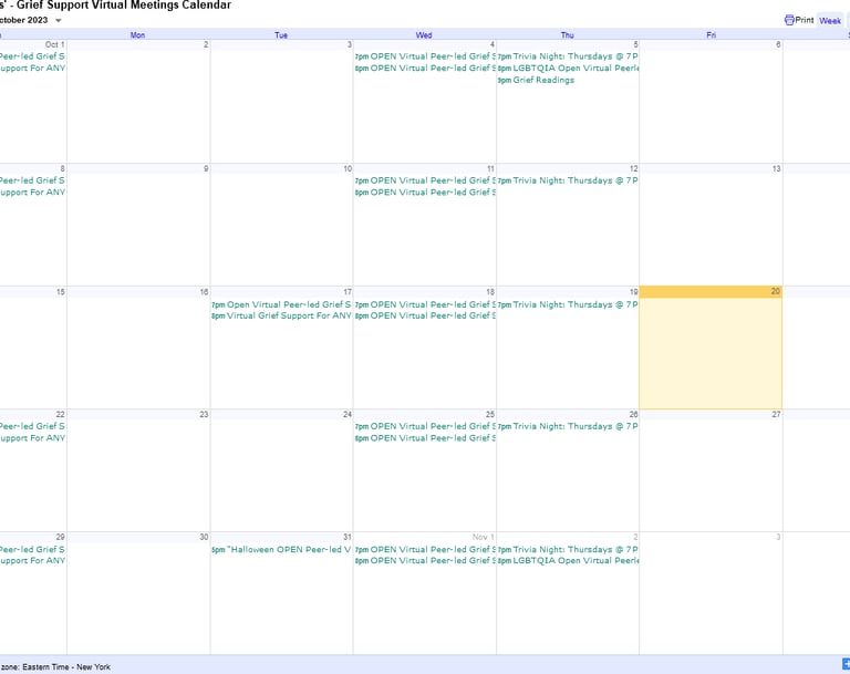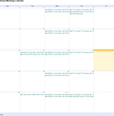 To check out the schedule of of My Grief Angels' weekly Open Virtual Peer-led Grief Support Groups by type of loss, please go to the Calendar tab on the MyGriefAngels.org website, or the link below: